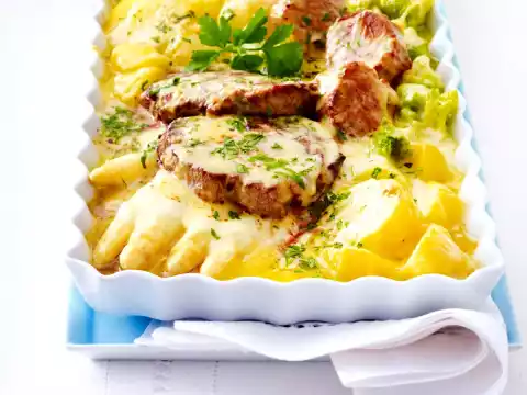 Place the vegetables and potatoes in one large or two small ovenproof dishes. Arrange medallions on top. Pour sauce over them. Sprinkle with remaining cheese. Put them in a preheated oven.