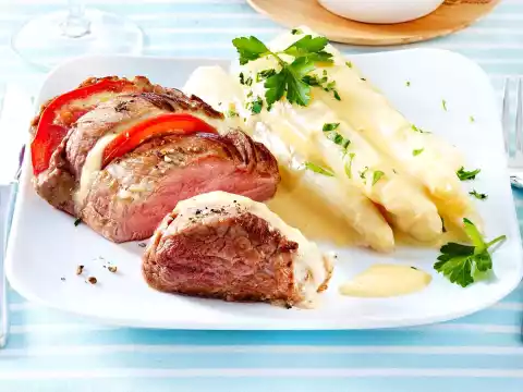 Cook the meat in the preheated oven (electric cooker: 175 °C/ convection oven: 150 °C/ gas: see manufacturer) for approx. 12 minutes in medium heat. Cook the asparagus in plenty of boiling salted water with 2 teaspoons of sugar for 12-15 minutes. Whisk the egg yolks and white wine, season with a little salt and sugar, whip until frothy over a hot water bath. Gradually fold in the liquid clarified butter. Season sauce with sugar, salt and lemon juice, keep warm