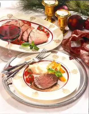 Wrap fillet in aluminium foil. Let it rest for about 10 minutes. Cut open and arrange everything. Served with: roast potatoes