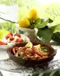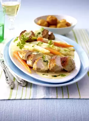 Remove the filet pan from the oven. Cut the chicken filets into slices. Drain the vegetables and arrange on a deep plate with the medallions and sliced fillets. Spread sauce over them.