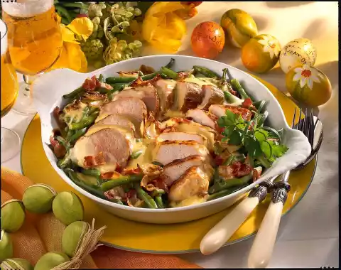 Pour the beans into a greased casserole dish. Cut the fillets into slices and arrange on top. Pour sauce over them. Bake in a hot oven (electric cooker: 225 °C / convection oven: 200 °C / gas: level 4) for 15-20 minutes. Served with: roast potatoes