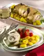Remove the chicken fillets from the oven, cut into slices and arrange on plates with mashed potatoes and tomatoes. Garnish with chervil.