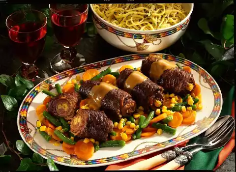Sprinkle roulades with pepper. Spread each roulade with 1 teaspoon of mustard and cover with 2 slices of bacon. Place two corn on the lower end of each roulade and some parsley, roll up the roulades and pin them with a wooden stick. Fry in hot oil, add bay leaves and 3/8 litres of water. Cover and braise over medium heat for about 45 minutes. In the meantime peel and slice the carrots. Cook the beans in boiling salted water for 5 minutes, drain and rinse in cold water. Rinse and drain the corn. Steam carrots in hot fat for about 5 minutes. Add beans and corn and steam for another 5 minutes, season with salt and pepper. Drain the broth of the roulades, remove bay leaves. Mix sour cream with flour, stir into the boiling stock. Bring to the boil again and season to taste with salt and pepper. Serve roulades with vegetables and sauce. Goes well with spaetzle with parsley butter