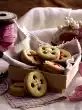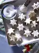 Mix flour, starch and baking powder, sieve into a mixing bowl. Add butter, sugar, vanilla sugar, egg and salt. Knead with the dough hook of the hand mixer. Knead the dough on a floured work surface to a smooth dough, wrap in foil, let rest for about 30 minutes. Roll out dough thinly on a floured work surface, cut out approx. 60 stars (4-5 cm Ø).
