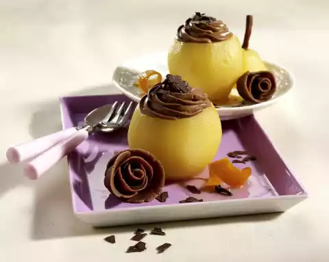 Remove pears from the stock and dab dry. Cut off the upper quarter (stem base) of the pear and carefully remove the core with a ball cutter. Whip the chocolate cream with the whisk of the hand mixer until stiff and fill into a piping bag with a star-shaped spout. Pour the chocolate cream into the pears and sprinkle with chocolate sprinkles. Stir 4 tablespoons of stock and starch until smooth. Bring the remaining stock to the boil and thicken slightly with the starch. Arrange the pears on some stock and decorate with the chocolate roses. Use the rest of the brew for other purposes