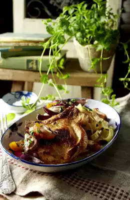 Wash the chops, dab dry and cut one pocket each. Put 1/4 of the apricot filling in each of the meat pockets and pin it with a wooden skewer or roulade needles. Cut the remaining apricots into slices. Peel the onions, also cut into slices