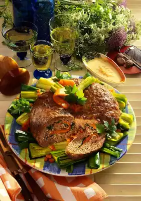Soak rolls in water. Peel and wash the carrots, cut them lengthwise into thin slices except for 1 carrot. Blanch slices in boiling salted water for about 2 minutes, rinse with cold water and drain. Wash the herbs and chop them coarsely, except for some lovage for garnishing. Peel and finely chop the onion. Knead minced meat, egg, squeezed out roll, onion and mustard.