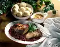 Form a snail and place it on a greased baking tray. Place a greased springform pan rim on top and cook in a preheated oven (electric range: 200°C/ gas: level 3) for about 40 minutes. In the meantime, boil up the stock and cream for the sauce and let it boil down in the open pot for about 10 minutes. In the meantime, grate cheese coarsely and melt it in the sauce, except for a few grated pieces. Season to taste with salt, pepper and nutmeg and keep warm. Clean and wash the leek and cut it into pieces of about 10 cm length. Cover the pieces and cook them in little boiling salted water for about 12 minutes. Cut the rest of the carrot into small cubes and add to the leek 2 minutes before the end of the cooking time. Arrange drained vegetables and chopped snail on a plate. Garnish with remaining carrot slices and lovage. Add sauce sprinkled with cheese and nutmeg