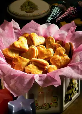 Cut out about 50 medium-sized hearts. Place them on a baking tray lined with baking paper. Mix egg yolk, sour cream, sugar and cinnamon. Spread half of the hearts with it. Bake everything in a preheated oven (electric: 200 °C/ gas: level 3) for 12-14 minutes until golden brown.