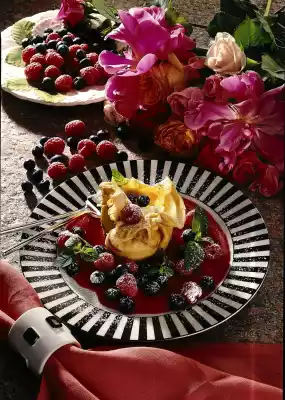 Press the edges of the dough together slightly at the top. Bake in the preheated oven (electric oven: 175 °C/ gas: level 2) for approx. 30 minutes. Select the berries, wash briefly. Puree 2/3 of the raspberries, pass through a sieve.
