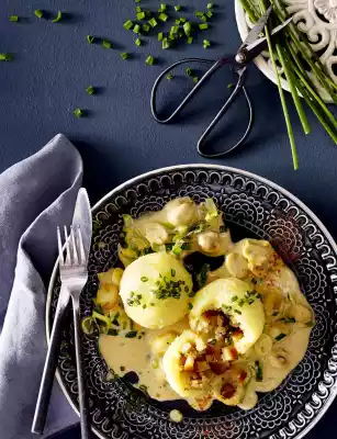 Wash the chives, shake dry and cut into fine rolls. Lift the dumplings out of the water, drain and arrange on plates with mushroom-leek cream. Sprinkle with chives and paprika.