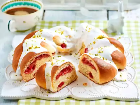 Wrap the strands into a cord and lay them on a baking tray lined with baking paper to form a wreath. Leave to rise again for another 15 minutes. Coat the wreath with egg yolk milk and bake in a preheated oven (electric range: 200 °C/ convection oven: 175 °C/ gas: level 3) for 30-35 minutes. Cover if necessary after approx. 20 minutes. Remove the wreath from the oven and let it cool down