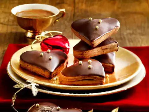 Chop the couverture separately. Melt dark chocolate coating with 25 g coconut oil, milk chocolate coating with 10 g coconut oil on two warm water baths. Pour the whole milk couverture into a small piping bag. Dip the hearts with the top side into the dark chocolate coating, drain and place on baking paper. In the middle of the hearts, draw a line with the lighter couverture, and draw through with a wooden skewer. Decorate with gold beads and leave to dry