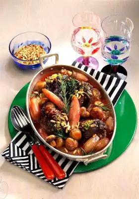 Add prepared vegetables and rosemary, braise and deglaze with 1/4 litre of water and wine. Sprinkle with pine nuts and orange peel. Braise in the preheated oven (electric cooker: 200 °C/ gas: level 3) for about 1 hour.