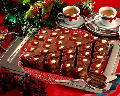 Decorate the cake with the almonds and cherries. Makes about 38 pieces.