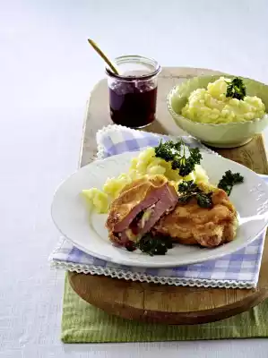 Peel and wash the potatoes and celery, cut them into pieces and boil them in 1 litre of boiling salted water for about 20 minutes until soft. Meanwhile, wash the meat and pat dry. Cut a pocket into each piece. Fill with camembert and cranberries. Wash parsley and shake dry. Pluck leaves from the stalks. Heat the oil. Fry the parsley briefly in it until crispy. Drain on kitchen paper