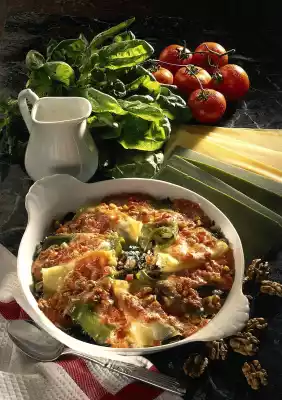 Clean the spinach and wash it thoroughly. Peel and finely dice the onions and garlic. Heat the oil in a pot. Fry half of the onions and garlic in it. Add the spinach, let it fall together, take it out and let it cool down. Crumble the cheese coarsely. Chop the nuts. Cook pasta plates in plenty of boiling salted water for 8 minutes. Remove the lasagne and rinse under cold water. Heat the remaining onions in the fat. Add flour and sauté. Deglaze with milk and chunky tomatoes. Boil up while stirring. Season to taste with salt and pepper. Mix spinach, cheese, 2/3 nuts and thyme. Spread the spinach filling on one half of the lasagne sheets and fold over. Place the lasagne sheets in a greased casserole dish. Spread the sauce over it, skin and core the tomatoes and cut into small cubes. Sprinkle the remaining nuts and tomato cubes on top. Bake in a preheated oven (electric: 200 °C/ gas: level 3) for 10 minutes