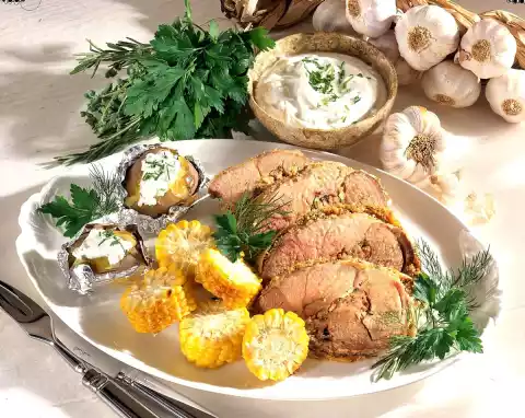 Baked potatoes and grilled corn on the cob taste good with it.