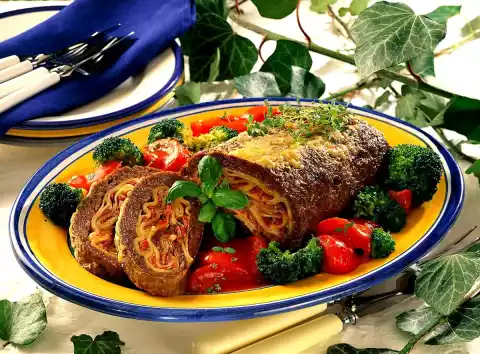 Spread another layer of lasagne sheets and the remaining tomato mixture. Roll up the chopped tomato mixture with the help of the foil. Place in the greased fat pan of the oven. Bake in the preheated oven (electric cooker: 200 °C/ gas: level 3) for about 45 minutes. In the meantime, bring tomato juice to the boil for the sauce. Stir cornstarch in cold water until smooth and thicken the boiling sauce with it. Bring to the boil again. Season with salt and pepper and keep warm. Clean and wash the broccoli and divide into small florets. Cook in boiling salted water for 5-8 minutes. Clean, wash and quarter the tomatoes. Heat the remaining oil in a frying pan, fry the tomato quarters briefly. Grate cheese and sprinkle over the meat roll 10 minutes before the end of the frying time. Cut the roulade open and serve with vegetables and sauce. Garnish with remaining herbs