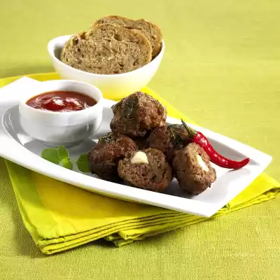 Knead the minced meat and breadcrumbs. Season with salt, pepper and paprika. Cut cheese into 5 cubes. Form minced meat into 5 small meatballs, adding 1 cube of cheese in the middle of each. Wash the oregano, dab dry, put something aside for garnishing.