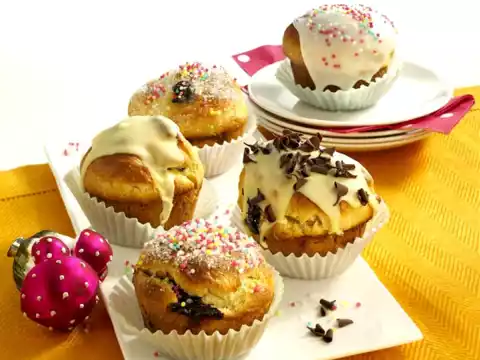 Mix 100 g icing sugar and liqueur and 100 g icing sugar and lemon juice to a smooth glaze. Spread 4 muffins each with liqueur and lemon icing. Sprinkle with chocolate rolls or love beads. Let the icing dry. Melt 1-2 tablespoons of butter and spread on the remaining muffins. Sprinkle 1-2 tablespoons of sugar and love beads on top. If necessary, place in paper cups