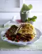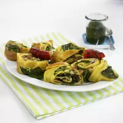 Remove the pancake tray from the oven. Spread ham and rocket on top. From the wide side, form a roll and cut into pieces. Add pesto and grilled peppers.