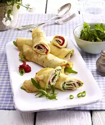 Spread cooled pancakes with 1 tablespoon cream cheese each. Spread rocket generously on top and finally cover with the turkey breast, paprika and spring onions. Roll up and halve the pancakes