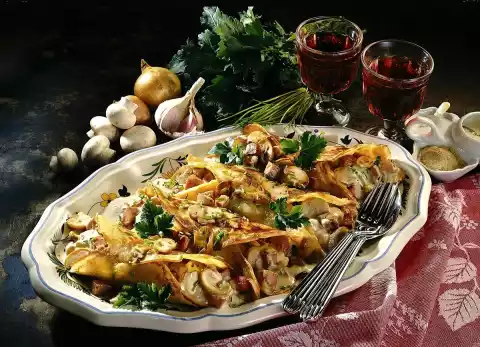Fold in diced ham and chives, except 1 tablespoon. Season to taste. Heat the fat in a pan. Bake 4 pancakes from the dough. Spread the mushroom sauce on the pancakes, fold over once and serve. Add the rest of the mushrooms and chives. Garnish with parsley