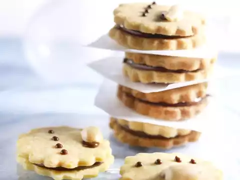 Remove the cookies and let them cool down on a cake rack. Put about 1/2 teaspoon of nut nougat cream on each half of the biscuits in the middle. Place the remaining circles on top. Chop the chocolate and melt over a warm water bath. Pour chocolate into a piping bag or freezer bag and cut off a small corner. Decorate cookies with chocolate and halved peanut kernels. Let them set in a cool place