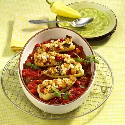 Remove 3 tablespoons. Pour the rest of the vegetables with the tomato pieces and season with salt and pepper. Bring to the boil briefly, then place the vegetables in an ovenproof dish. Place the peppers on the vegetables and season with salt and pepper. Spread the meat and vegetables set aside on the pepper halves. Coarsely crumble the feta cheese and sprinkle over it. Bake in a preheated oven (electric cooker: 200 °C/ convection oven: 175 °C/ gas: level 3) for 20-25 minutes. Garnish with marjoram