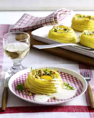 Press 1-2 teaspoons of ricotta in the middle of each. Place 1 egg on each. Bake the potato nests in the preheated oven (electric cooker: 200 °C/ convection oven: 175 °C/ gas: level 3) for about 20 minutes. Meanwhile bring the stock, milk and cream to the boil and simmer for about 5 minutes.