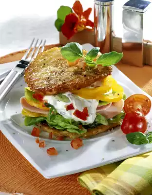 Clean and wash the peppers and cut them into rings or strips. Wash the salad and drain well. Cover 4 buffers each with lettuce, ham, paprika and sour cream. Place the remaining buffers on top as a lid. Garnish with basil if necessary