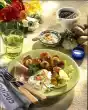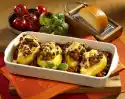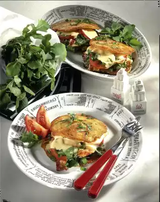 Cover half of the potato pancakes with bacon, rocket and tomatoes. Season with salt and pepper and cover each with a slice of cheese. Place the remaining potato pancakes on top as a lid and heat in the closed pan at medium heat for 3-4 minutes until the cheese has melted. Cut the rest of the rocket into fine strips and sprinkle on the filled potato pancakes. Serve garnished with rocket salad and tomato wedges