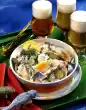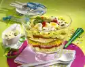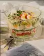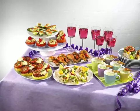 Season with salt and pepper. Clean and wash the salad and pluck into small pieces. Cut the remaining eggs into slices. Cut the roast into thin slices. Spread the plucked lettuce and tartar sauce on top. Fold up the roast slices in a U-shape and fix them with wooden sticks. Garnish with tacochips, ice creams, parsley leaves and pickled peppers