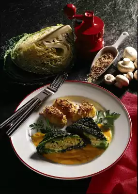 Wash the potatoes and boil them with their skins in water for about 20 minutes. Remove 8 savoy cabbage leaves and cut in half. Blanch in salt water, rinse in ice water and drain. Chop the rest of the savoy cabbage. Clean and quarter the mushrooms. Sweat both in 1 tablespoon of butter. Season with salt, pepper and nutmeg. Stir cream cheese and egg yolk until smooth. Fold in savoy cabbage and mushrooms. Dab savoy cabbage leaves dry. Spread the cream cheese mixture in the middle of the savoy cabbage leaves. Fold the leaves into a package. Pin them with wooden skewers. Heat the oil. Sauté the savoy cabbage packets briefly. Top up with 200 ml stock. Leave to stand for 10 minutes. Peel, wash and chop the carrots. Peel and chop the onion and sauté with the carrots in 1 tablespoon butter. Fill up with remaining stock and cream and cook for 10-12 minutes. Puree with the cutting stick of the hand mixer. Season to taste with salt, pepper and nutmeg. Peel potatoes, cut in half, roll in sesame seeds and fry in remaining butter until golden brown. Serve the savoy cabbage parcels garnished with the sesame potatoes, carrot sauce and a bouquet of parsley