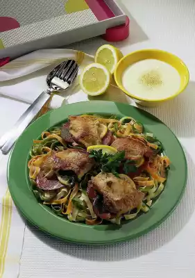 Cook the pasta in plenty of boiling salted water with the remaining oil for seven minutes, drain. Arrange the meat on the noodles. Garnish with a slice of lemon and parsley. Serve with extra sauce.
