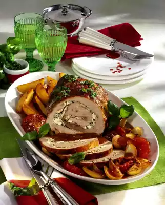 Sprinkle with salt. Cut the rest of the basil into strips, except for some for garnishing. Lift the meat out of the casserole, loosen the kitchen string and cut the roast into slices. Arrange rolled roast, roast potatoes and braised vegetables with the sauce on a deep plate.