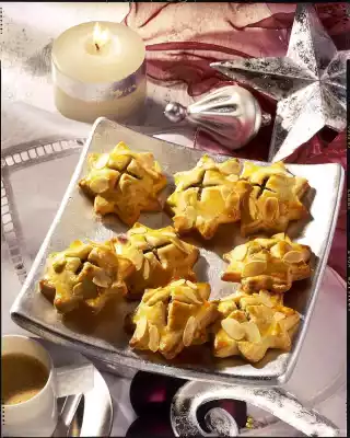 Mix the egg yolk and cream and brush the stars with it. Sprinkle with flaked almonds and bake the trays one after the other in a preheated oven (electric oven: 200 °C/ gas: level 3) for 12-15 minutes.