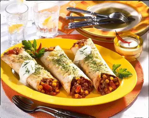 Spread the minced meat mixture over it and roll it up. Place on a baking tray. Roughly grate the cheese and sprinkle on the tortillas. Bake in a preheated oven (electric cooker: 200 °C/ gas: level 3) until the cheese has melted.
