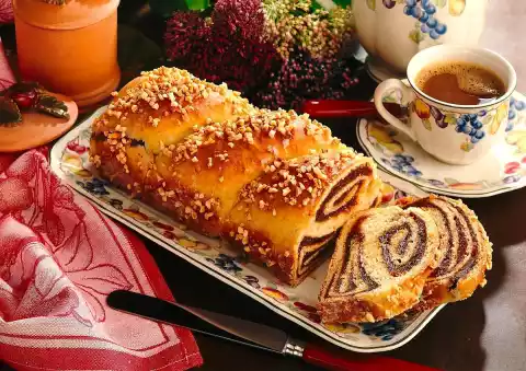 In the meantime mix marzipan and plum puree. Roll out the yeast dough to a square (30 x 30 cm). Halve and spread the filling on both dough pieces. Roll up the dough from the long side. Turn both dough rolls around each other like a cord and place them in a greased, flour-spread box form. Cover and allow to rise for about 30 minutes. Whisk the egg yolk and cream and brush the surface of the dough with it. Bake in the preheated oven (electric: 175 °C/ gas: level 2) for 35-40 minutes. Let cool off. Roast the almonds.
