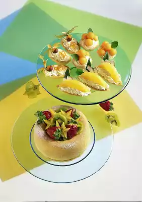 Bring juice and wine to the boil, mix with vanillin sugar and orange juice. Bind with mixed cornstarch. Fold in strawberries and fill into the yeast ring. Dust with icing sugar and decorate with carambola and kiwi slices and strawberries.