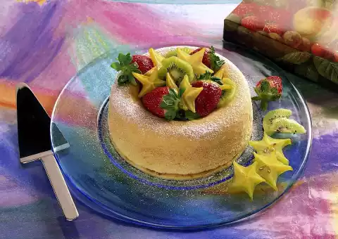 Bring juice and wine to the boil, mix with vanillin sugar and orange juice. Bind with mixed cornstarch. Fold in strawberries and fill into the yeast ring. Dust with icing sugar and decorate with carambola and kiwi slices and strawberries.