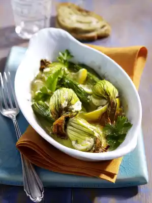 Cut 1 half into corners, squeeze out the other half. Place the flowers and lemon corners in 1-2 ovenproof baking dishes. Melt butter. Add 1 tablespoon of lemon juice, mix well, season with some salt and lemon pepper and pour over the flowers.