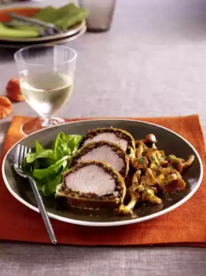 Heat butter in a frying pan. Fry the remaining mushrooms for about 5 minutes. Add the remaining chopped parsley and season with salt and pepper. Cut the meat into slices. Arrange meat, chanterelles and salad on plates. Add sauce