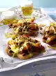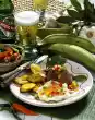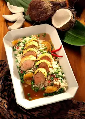Mix the peas and pineapple into the rice 7 minutes before the end of the cooking time. In the meantime, mix the grated coconut, eggs and mustard for the crust. Deglaze the fillet with stock, set aside. Press the crust firmly onto the fillet and bake in a preheated oven (electric range: 225 ° C/ gas: level 4) until golden brown.