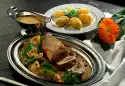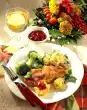 Add pineapple juice to the stock. Stir cornflour and 4 tablespoons of water until smooth and add to the stock. Bring to the boil. Season to taste with salt and pepper. Arrange the fillet cut open with the colored rice and the sauce on a plate.