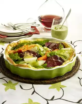 Wash the fillet of beef, dab dry and cut in half lengthwise. Heat oil in a pan. Fry meat over medium heat for about 20 minutes, turning. Put the puff pastry without baking paper into a greased quiche tin (approx. 26 cm Ø), prick several times with a fork and cover with the baking paper. Add the dried peas. Pre-bake the dough in a preheated oven (electric cooker: 200 °C/ convection oven: 175 °C/ gas: level 3) for approx. 25 minutes. Season meat with salt and pepper, wrap in foil and let it rest for a short time. Deglaze the roast with stock and whipped cream and bring to the boil. Mix sour cream and starch, stir into the sauce and bring to the boil once. Wash the basil, dab dry and chop coarsely except for a little to garnish. Cut cress from the bed. Add basil and half of the cress to the sauce and puree.