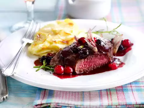 Add the remaining currants. Arrange meat, sauce and potato gratin.