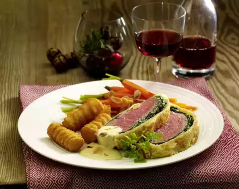 Slightly moisten 5 puff pastry slices with cold water, place them on top of each other and roll out into a rectangle (approx. 35 x 40 cm) on a floured work surface. Separate the egg and brush the edges of the pastry with egg white. Sprinkle breadcrumbs the size of the fillet on the front edge of the dough and add some spinach. Place the fillet on top. Put the remaining spinach on the fillet, press it down and wrap it in the dough. Press the edges of the dough well. Roll out remaining dough slightly and cut into strips, brush with egg white and garnish the fillet with it. Place on a baking tray lined with baking paper. Mix the egg yolk and 1 teaspoon of milk and brush the fillet with it. Bake in a preheated oven (electric cooker: 200 °C/ convection oven: 175 °C/ gas: level 3) for 40-45 minutes. Peel the carrots, leave some green and wash them. Cook in boiling salted water for 6-8 minutes.