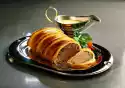 Spread the middle of the pastry plate with some herb sauce. Place the meat on top, spread the remaining farce on the meat. Separate the egg, brush the edges of the dough with egg white. Roll over the dough, press on, cut off any excess dough.